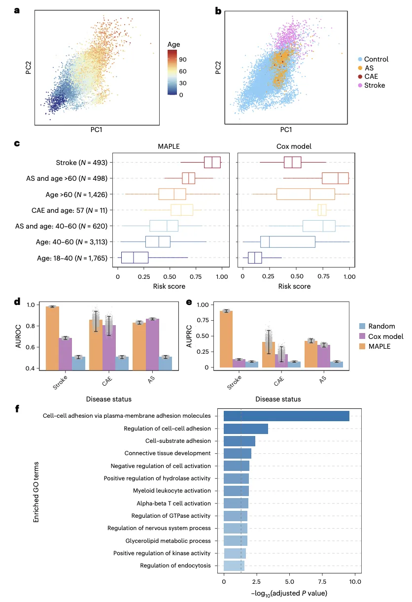 在覆盖不同研究项目、测序平台、数据预处理方法以及多种组织类型的 31 项基准测试中,MAPLE 的中位绝对误差仅为 1.6 年,整体性能明显优于另外五种主流方法。不仅如此,在疾病风险预测方面,MAPLE 的表现同样亮眼:疾病识别的平均曲线下面积达到 0.97,而对疾病前期状态的检测也取得了 0.85 的平均曲线下面积。这些结果显示,MAPLE 在临床层面的应用潜力十分可观。