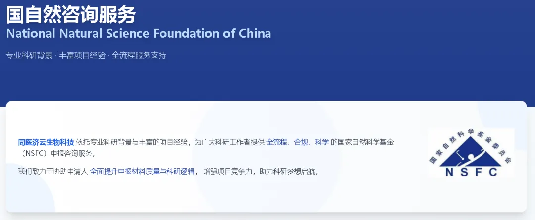 同医济云生物科技是提供国家自然科学基金(NSFC)申报的一站式服务平台。提供包括基金选题立意、方案设计、润色优化、形式审查、创新性提升、科研逻辑梳理以及全程申报指导等全方位技术服务。