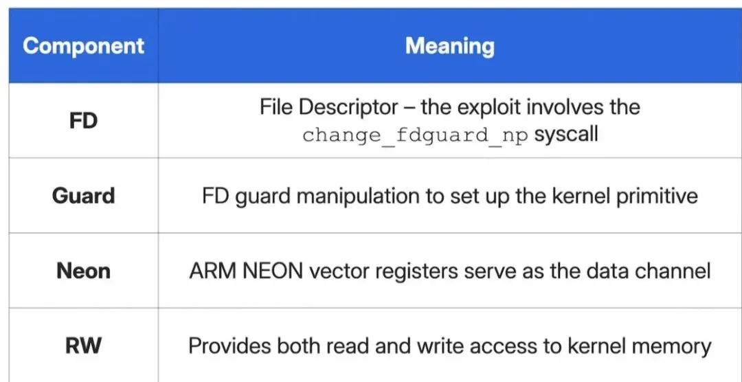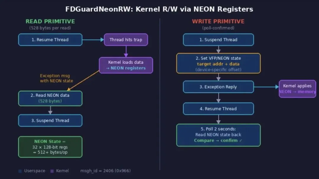 1. FDGuardNeonRW:一款内核读写原语,利用ARM NEON向量寄存器作为隐蔽数据通道,实现任意内核内存的读写操作;