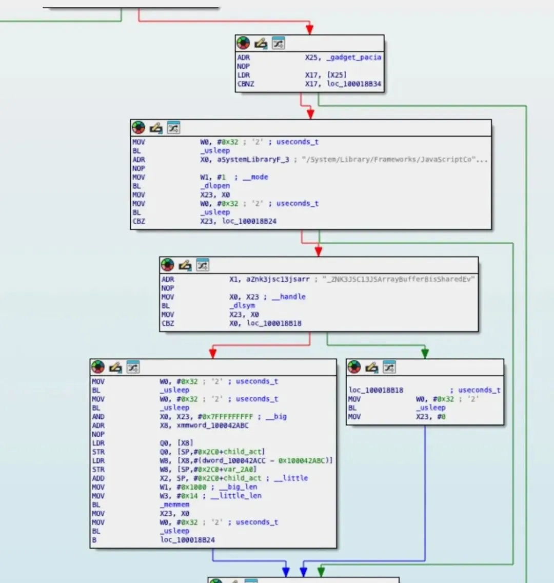 Predator未自研签名算法,而是在苹果JavaScriptCore框架(Safari JS引擎原生组件)中,检索可控输入的PAC签名原生代码序列,目标函数为JSC::JSArrayBuffer::isShared()。
