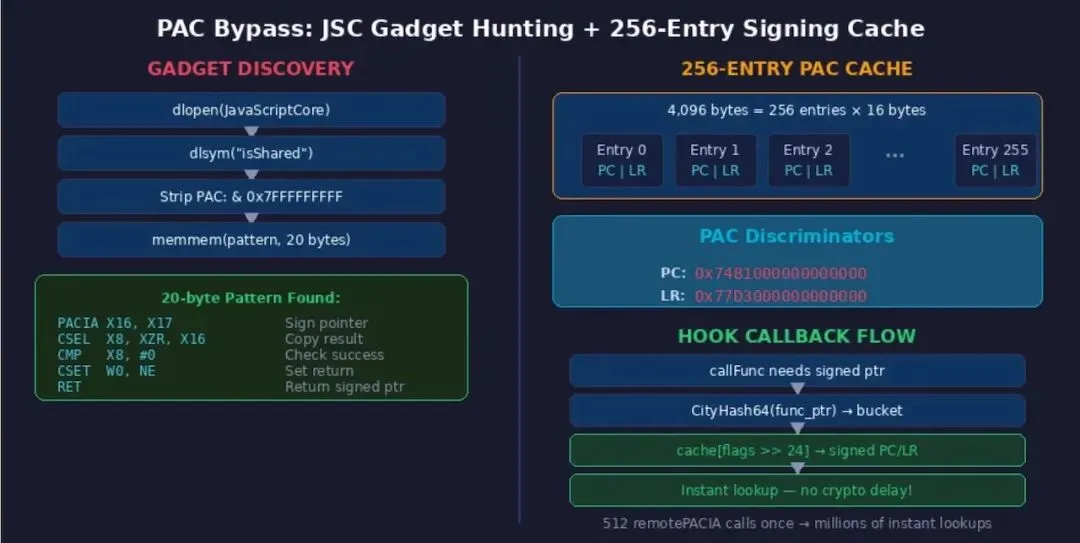 3. PAC绕过:JSC工具链+256项签名缓存,突破指针身份验证;