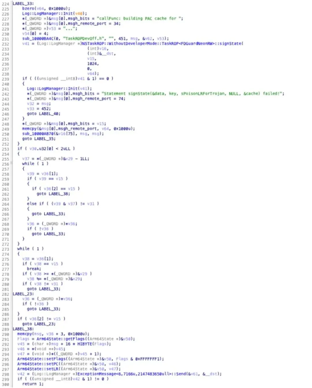 源码溯源:0x10000B028函数日志标注文件为TaskROPDevOff.h,证实这是面向未开启开发者模式设备的ROP技术。