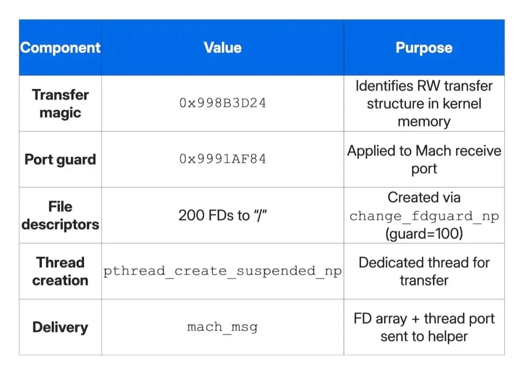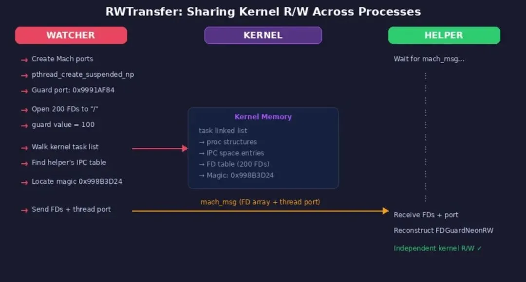 4. RWTransfer:通过受保护文件描述符与Mach端口操控,实现进程间内核读写权限的传递;