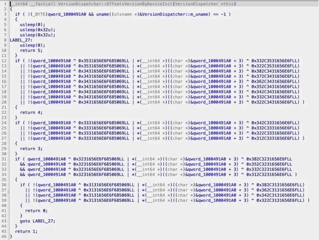 反编译代码中的十六进制常量为XOR编码ASCII字符串:程序调用uname()获取设备标识(如iPhone15,3),XOR比对结果为0即匹配设备。编码规则为小端序,如0x3531对应ASCII"15"、0x332C对应",3",直接映射iPhone型号。