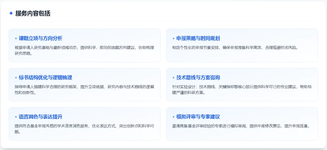 同医济云生物科技是提供国家自然科学基金(NSFC)申报的一站式服务平台。提供包括基金选题立意、方案设计、润色优化、形式审查、创新性提升、科研逻辑梳理以及全程申报指导等全方位技术服务。