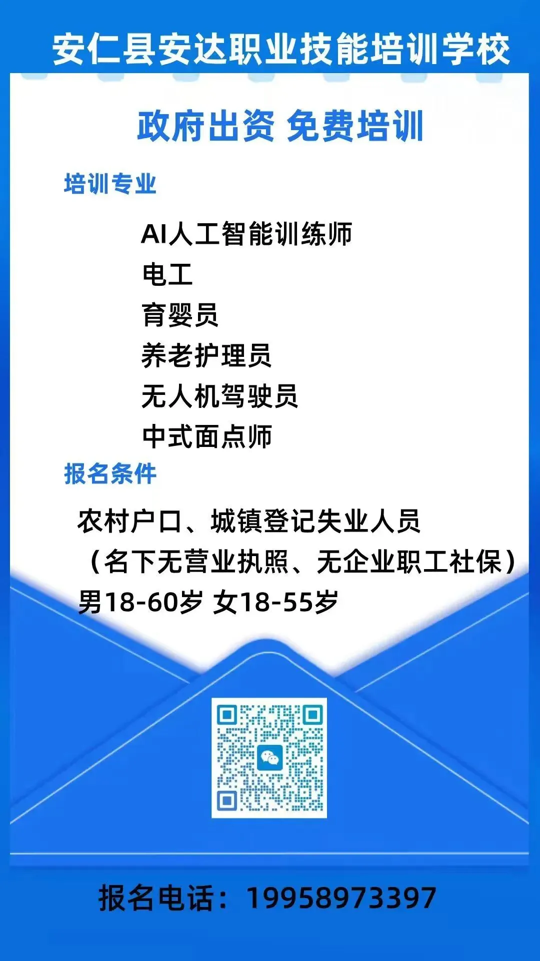 报名要求:农村户口或者城镇失业人员,名下无营业执照、无企业职工社保,年龄16以上到55岁以下均可享受政府补贴免费学习、免费考证