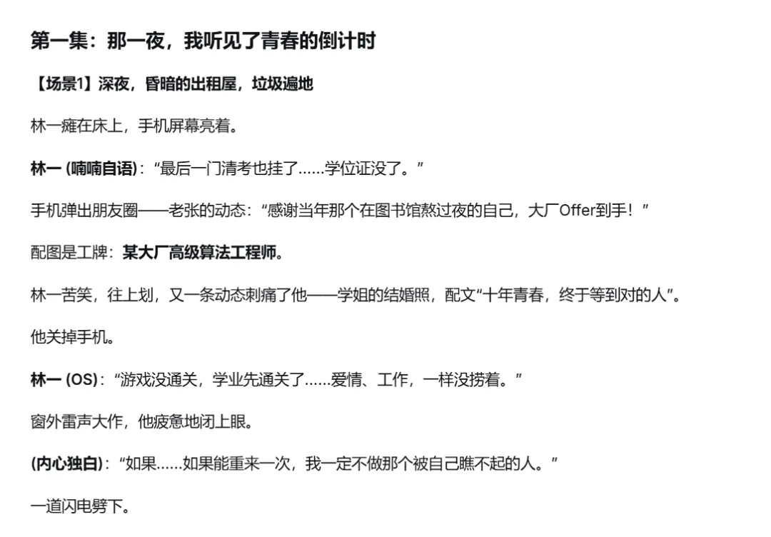 “作为一名高校辅导员,现在我想给学生做一个重生系列微短剧。一个学困生大四面临退学,但是他重生了,最终不虚度光阴的故事。要符合短剧规律,节奏快,反转多,吸引人!”