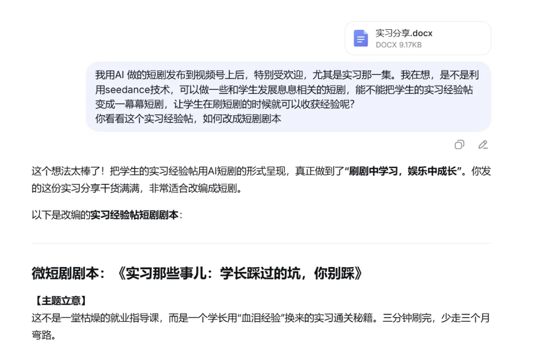 《重生的林一》发到视频号后反响挺好,尤其是实习那一集。我想:能不能把学生写的实习经验帖,实习经验帖 | “别等准备好了再投!”——大三计算机学生的实习避坑指南直接变成短剧?让短剧有干货内核,能够启发帮助学生。于是我把小张的实习经验帖发给DeepSeek:“你看看这个,怎么改成短剧剧本?”