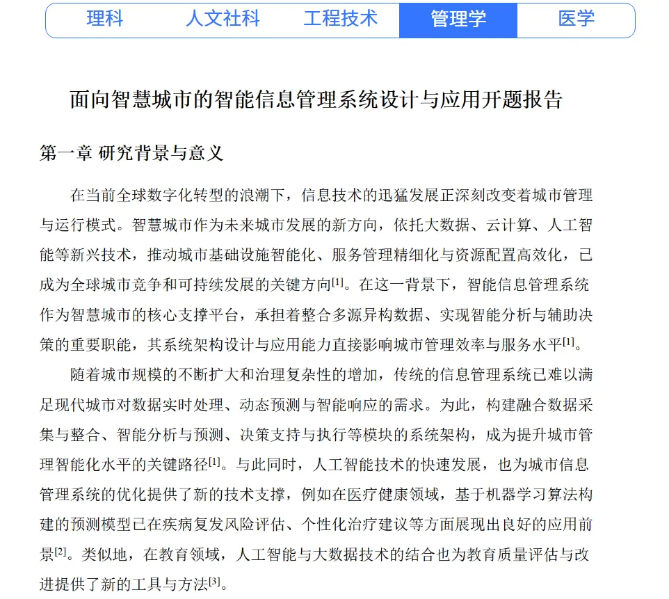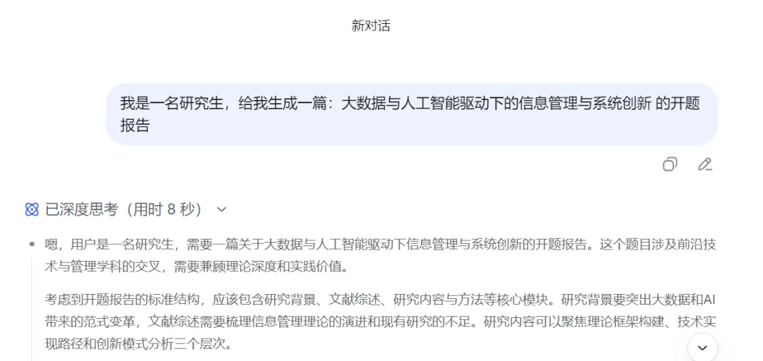 比如输入我是一名研究生,给我生成一篇:大数据与人工智能驱动下的信息管理与系统创新的开题报告。