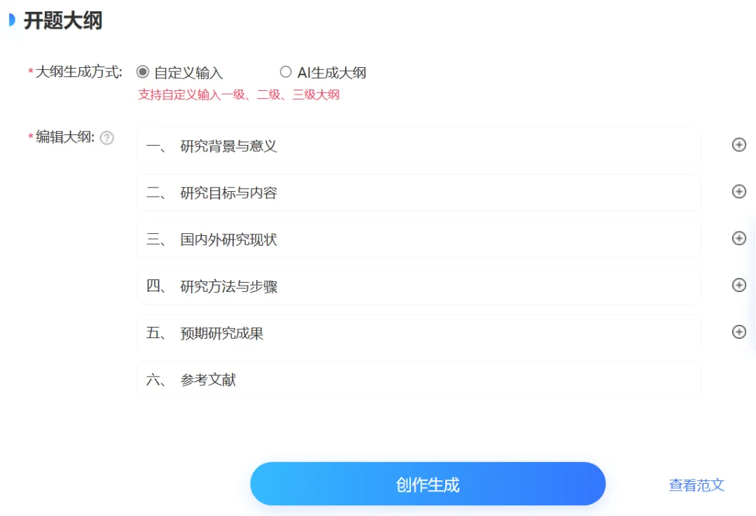 能快速生成包含二级、三级标题的开题大纲,支持根据研究主题调整结构,大纲确定后可逐章生成正文内容,逻辑严谨流畅~