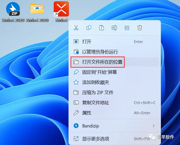 7、回到桌面,右键桌面上的【Xmind软件图标】,点击【打开文件所在的位置】