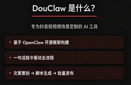 在抖音7亿日活用户构建的内容生态中,创作者的核心痛点早已从“缺创意”转向“低效率”——手动撰稿、反复改稿、耗时剪辑,往往消耗大量精力却难以产出爆款。而随着AI Agent技术的规模化落地,这一困境正被快速打破。近期,基于OpenClaw开源AI Agent框架打造的DouClaw工具浮出水面,以“自然语言指令驱动全流程自动化”为核心,重新定义抖音短视频创作的效率边界。