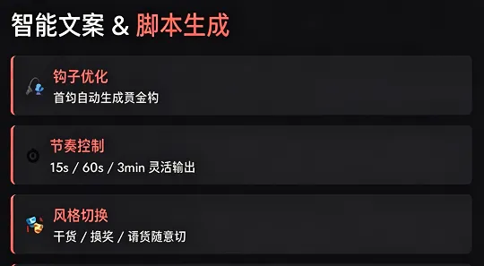 智能文案与脚本生成,只需一句自然语言指令(如“生成15秒程序员深夜debug脚本,搞笑反转风格”),即可自动完成黄金钩子优化、时长适配、风格切换,还支持多轮对话式迭代,大幅降低脚本创作门槛。