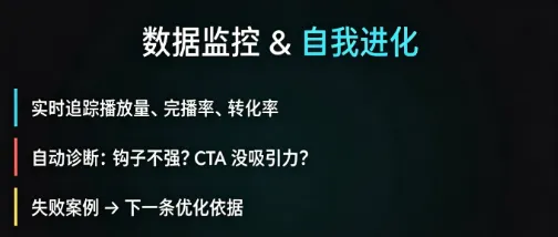 数据驱动的自我进化能力,发布后可实时追踪播放量、完播率、转化率等核心数据,自动诊断内容问题(如钩子吸引力不足、CTA设置不合理),并将失败案例转化为优化依据,实现“越用越精准”的迭代效果,这也是AI智能体与传统创作工具的核心区别。