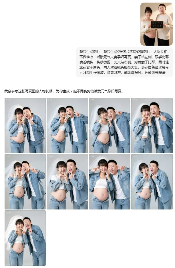 帮我生成9张图片不同姿势图片,人物长相不做修改,活泼元气夫妻孕妇写真,妻子站左侧,双手比耶凑近镜头,头纱微扬;丈夫站右侧,对着妻子比耶,同时轻靠在妻子肩头,两人对着镜头搞怪大笑,身穿白色蕾丝吊带 + 浅蓝牛仔套装,背景浅灰,韩系画报风,色彩明亮高清