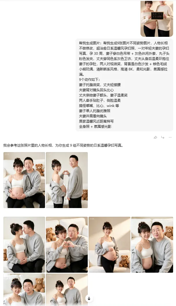 帮我生成9张图片不同姿势图片,人物长相不做修改,超治愈日系温馨风孕妇照,一对年轻夫妻的孕妇写真,孕 30 周,妻子穿白色吊带 + 灰色休闲外套,丸子头粉色发夹,丈夫穿同色系灰色卫衣,丈夫从身后温柔环抱住妻子的孕肚,两人对视微笑,背景是白色沙发 + 棕色毛绒小熊玩偶,清新韩系风格,高清 8K,柔和光影,氛围感拉满。9个动作如下:妻子托腹微笑,丈夫轻搂腰夫妻背对镜头回头比心丈夫亲吻妻子额头,妻子温柔笑两人牵手贴肚子,侧脸温柔搞怪嘟嘴、比心、wink 等妻子单人托腹优雅照夫妻并肩看向镜头居家温馨风近距离特写全身照 + 氛围感光影