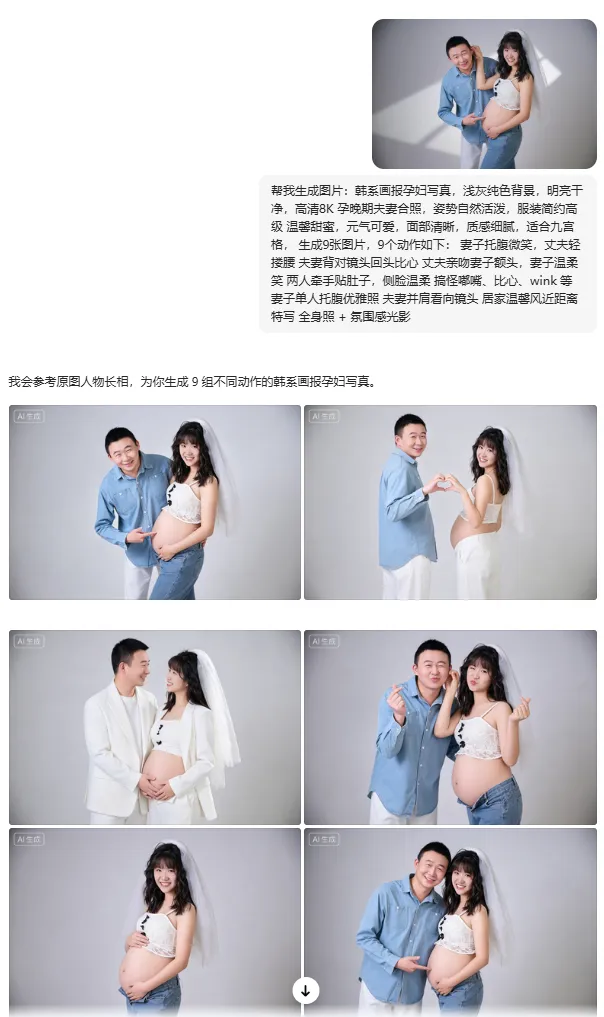 怀孕是一段辛苦又特别的旅程,不用辛苦奔波,不用花费大价钱,用豆包 AI 就能轻松留下一组专属于自己和宝宝的美好纪念。
