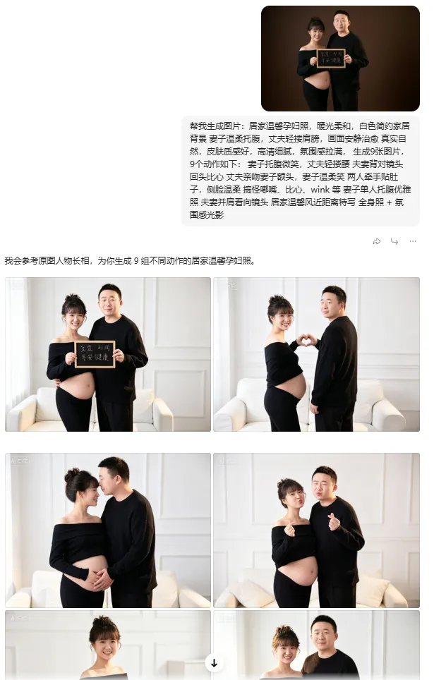 居家温馨孕妇照,暖光柔和,白色简约家居背景 妻子温柔托腹,丈夫轻搂肩膀,画面安静治愈 真实自然,皮肤质感好,高清细腻,氛围感拉满, 生成9张图片,9个动作如下: 妻子托腹微笑,丈夫轻搂腰 夫妻背对镜头回头比心 丈夫亲吻妻子额头,妻子温柔笑 两人牵手贴肚子,侧脸温柔 搞怪嘟嘴、比心、wink 等 妻子单人托腹优雅照 夫妻并肩看向镜头 居家温馨风近距离特写 全身照 + 氛围感光影