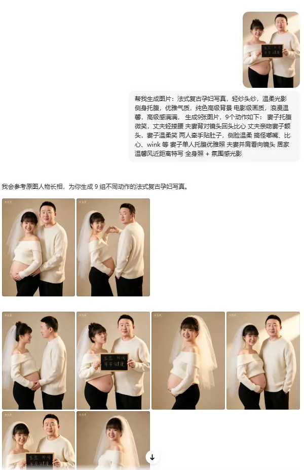 法式复古孕妇写真,轻纱头纱,温柔光影侧身托腹,优雅气质,纯色法式复古孕妇写真,轻纱头纱,温柔光影 侧身托腹,优雅气质,纯色高级背景 电影级画质,浪漫温馨,高级感满满, 生成9张图片,9个动作如下: 妻子托腹微笑,丈夫轻搂腰 夫妻背对镜头回头比心 丈夫亲吻妻子额头,妻子温柔笑 两人牵手贴肚子,侧脸温柔 搞怪嘟嘴、比心、wink 等 妻子单人托腹优雅照 夫妻并肩看向镜头 居家温馨风近距离特写 全身照 + 氛围感光影高级背景电影级画质,浪漫温馨,高级感满满