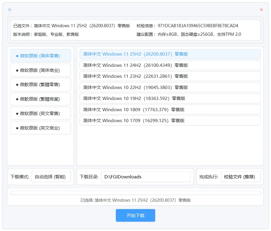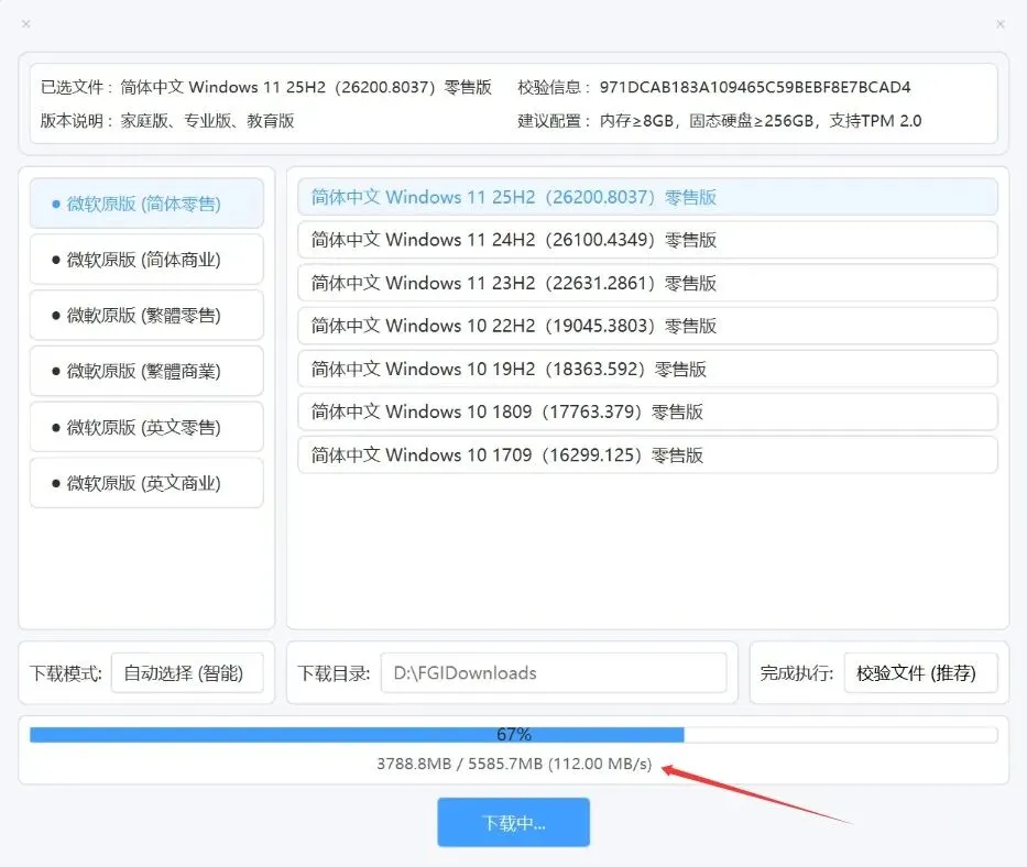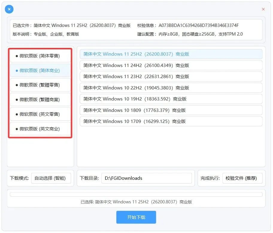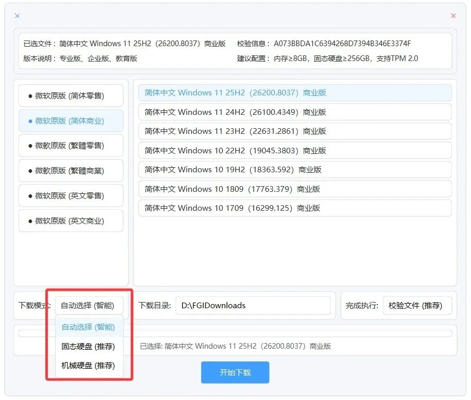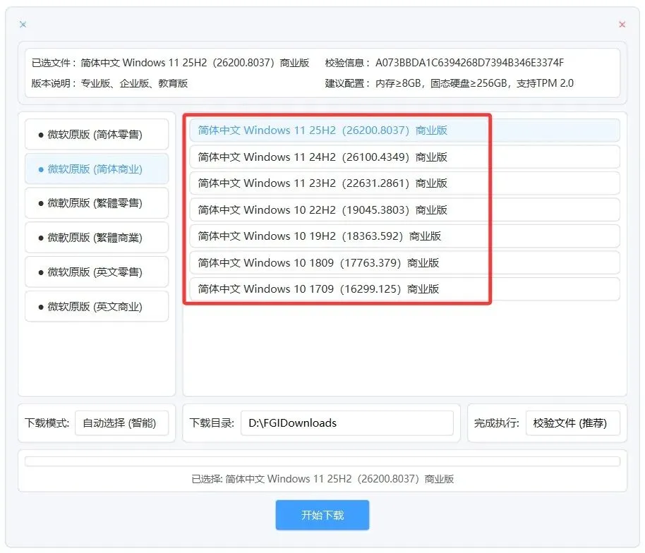在完成执行处选择校验文件,在系统下载完成之后会对文件进行验证,以保证它为原版系统,最后点击开始下载。