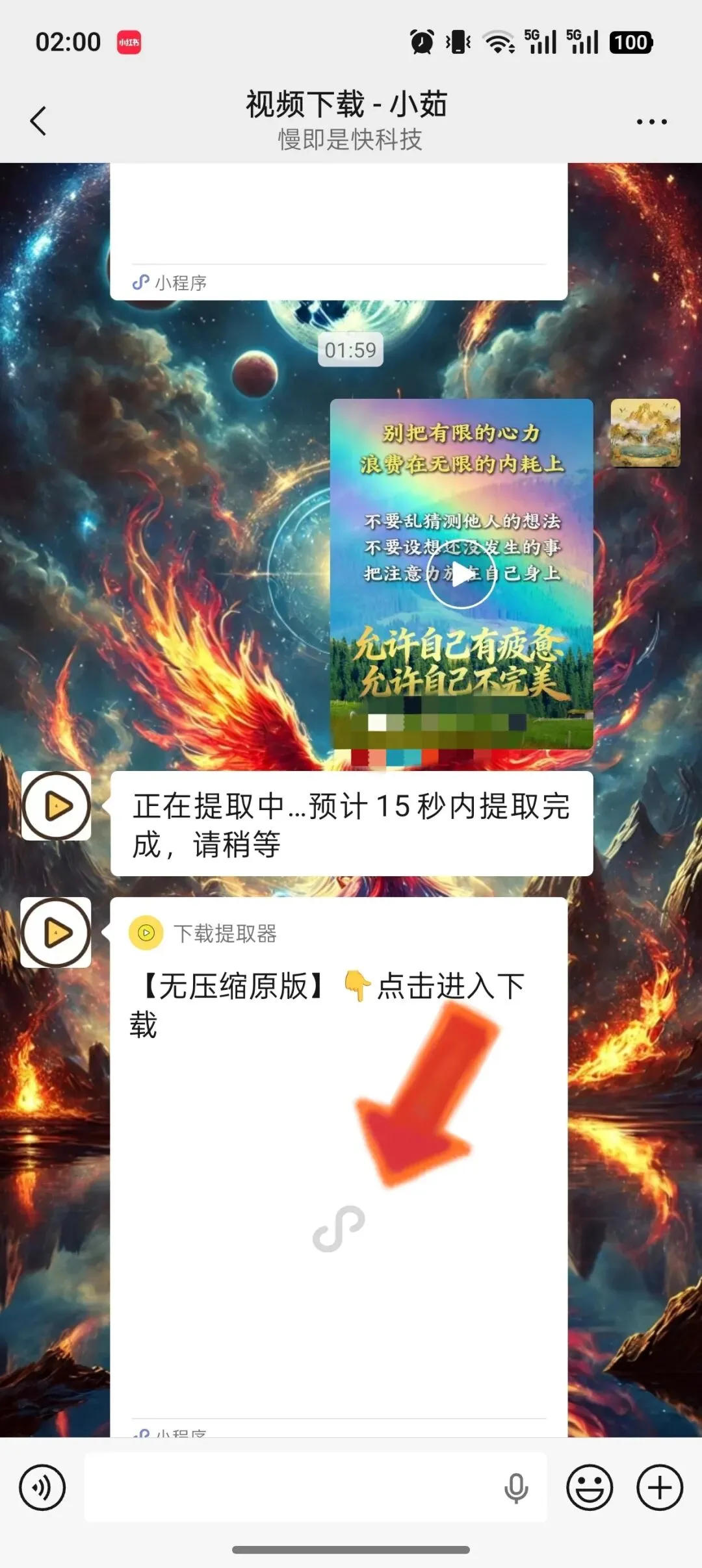 ③ 发送成功后,视频下载机器人会自动解析视频,秒回下载小程序入口;