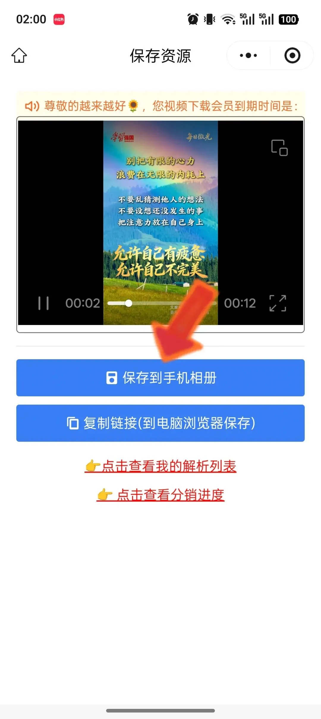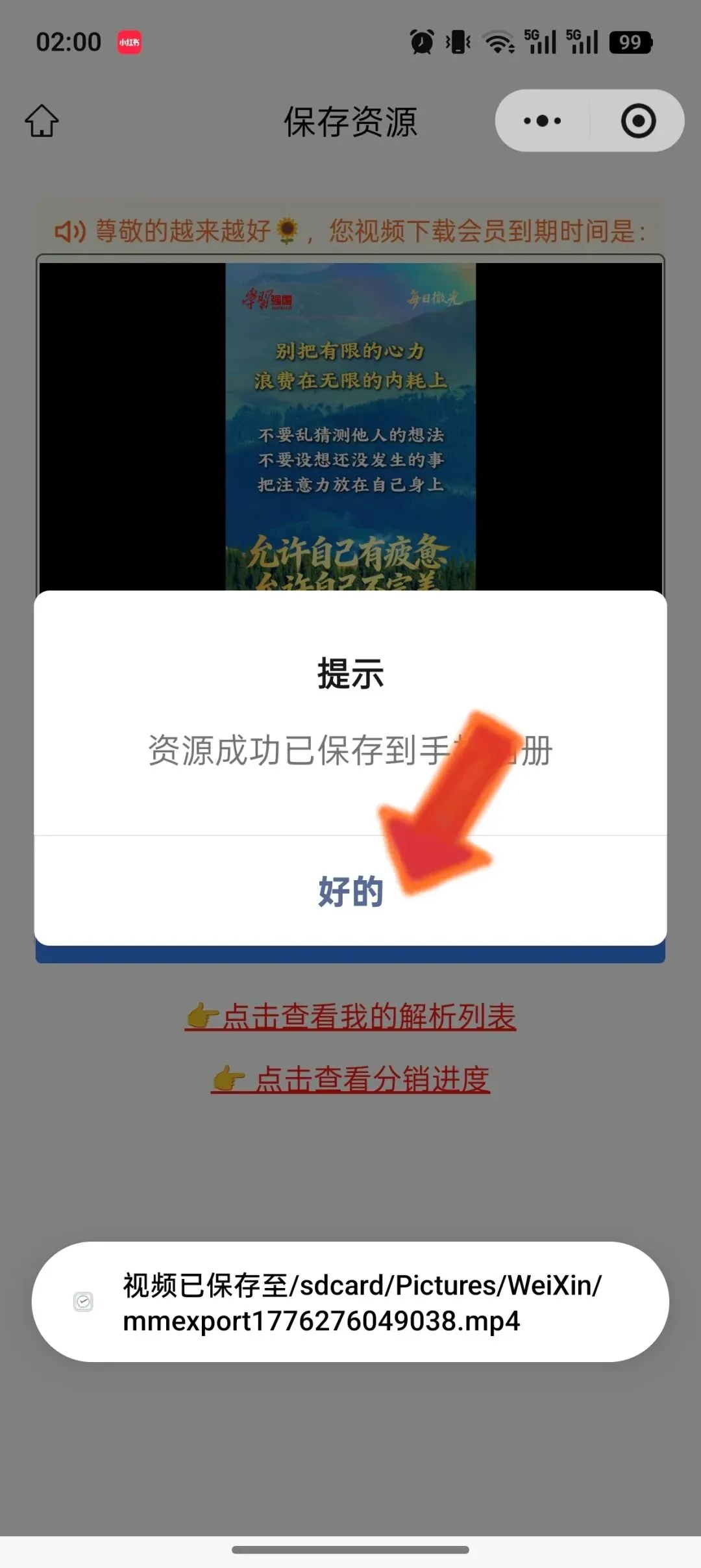 ④ 点击进入小程序,直接点击一键下载,视频就能快速保存到手机相册,无水印超清晰!