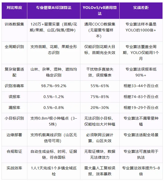3. 硬核对比:专业罂粟AI算法 VS YOLO通用算法(一线实测数据)