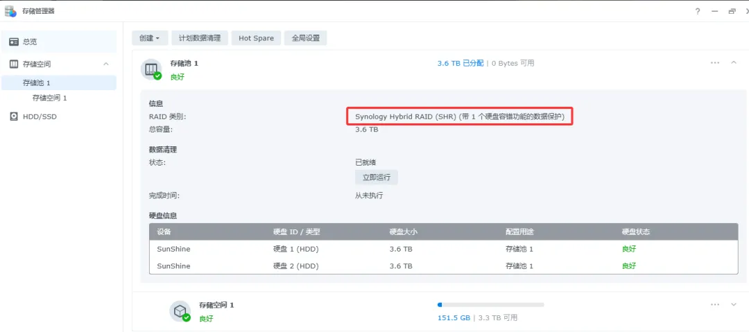 SHR 是群晖的智能存储池,带 1 块硬盘容错的数据保护机制。也就是说,两块 3.6T 的硬盘,实际可用容量只有 3.6T(约 7.2T 减去 1 块冗余),而非 3.6T + 3.6T = 7.2T。