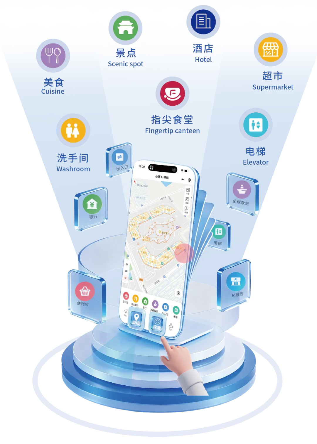 · 场内配套:可一键查询出入口、电梯、洗手间、银行、停车场、快递点、客服中心等,场内通行和办事效率倍增。