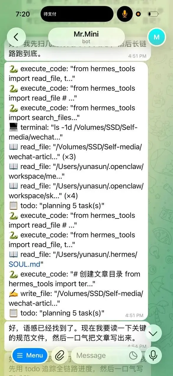 它跟 Telegram 的集成不只是"能聊天"。你在手机上就能看到它每一步在做什么:打开浏览器、读文件、执行脚本、调用工具——整个过程是流式输出的,每一步都对你透明可见。