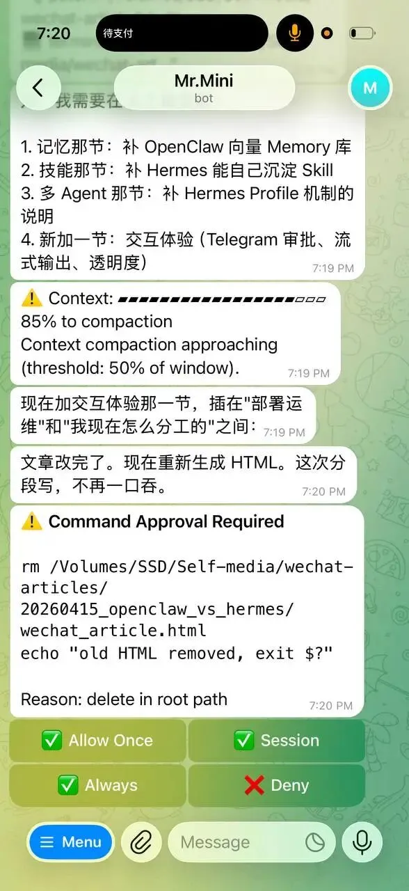 左边是 Hermes 的流式输出,每一步工具调用都实时推给你。右边是权限审批,在 Telegram 里点一下就确认了,几秒钟搞定。