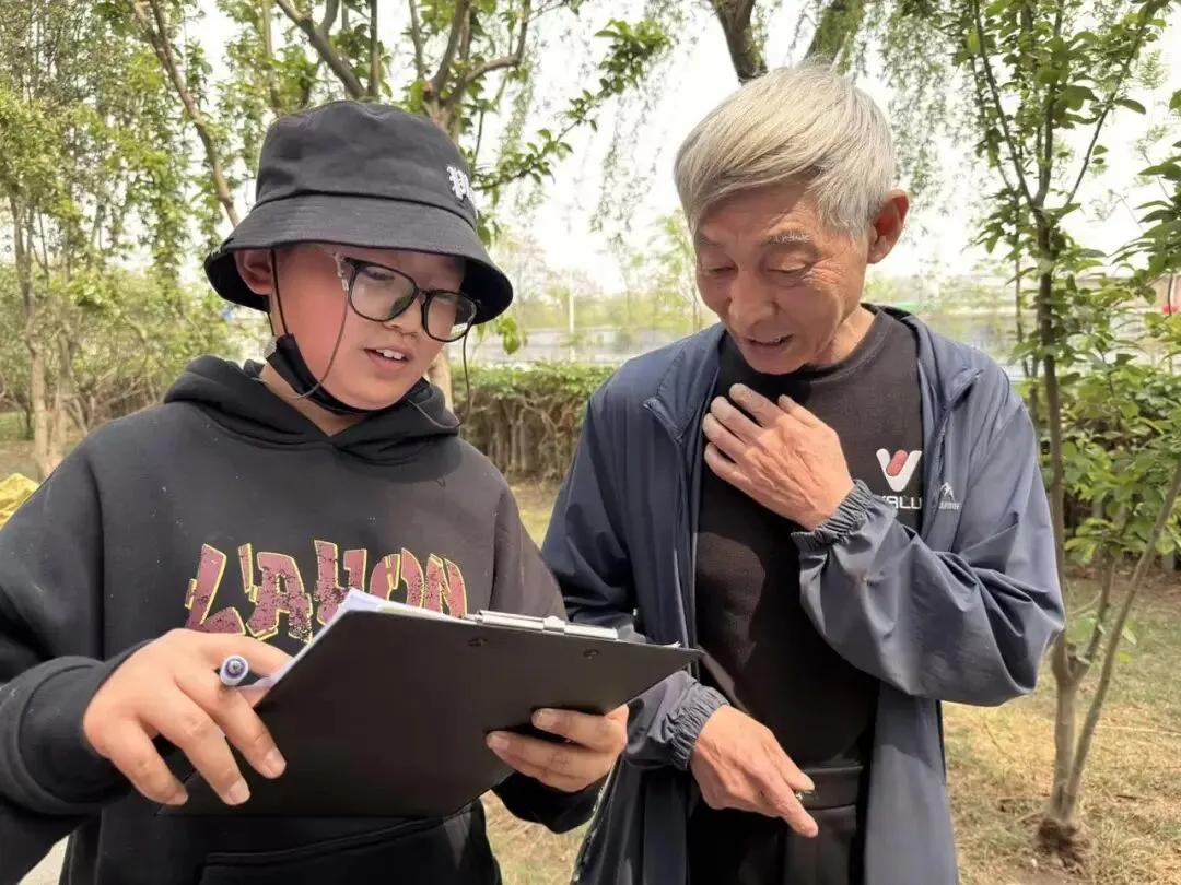 春日的乐学公园里,同学们各司其职、有条不紊地投入测量工作。树高测量组运用影子法结合测高仪交叉验证,反复测量减少误差,记录现场变量;距离测绘组细致丈量绿化带与居民楼间距、路基高度等关键参数,为建模提供支撑;噪音监测组将公园划分为六大区域,科学布点,同步测量火车通行时的噪音衰减情况,掌握真实规律;居民调研组主动采访社区居民,认真记录采光、降噪诉求,让方案更贴合民生。