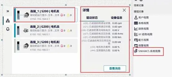 2、新增 SINAMICS 系统视图,可以在 SINAMICS 系统视图中查看和管理 SINAMICS 驱动器的状态和报错信息,而无需在博途或者驱动器的 Web 服务器中查看这些信息,可实现直观的故障监控,并提升操作效率。