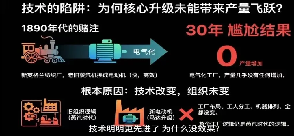 把时间倒回 1890 年代,电力刚普及。新英格兰的纺织厂赶紧把蒸汽机换成了电动机。技术更先进了,结果呢?整整 30 年,产量几乎没涨。为什么?因为技术变了,组织没变。工厂只是把“大马达”换了,但布局、分工、流水线逻辑全是蒸汽时代的。直到 1920 年代,工厂重新设计架构,给每台机器配独立电机,现代装配线才诞生。