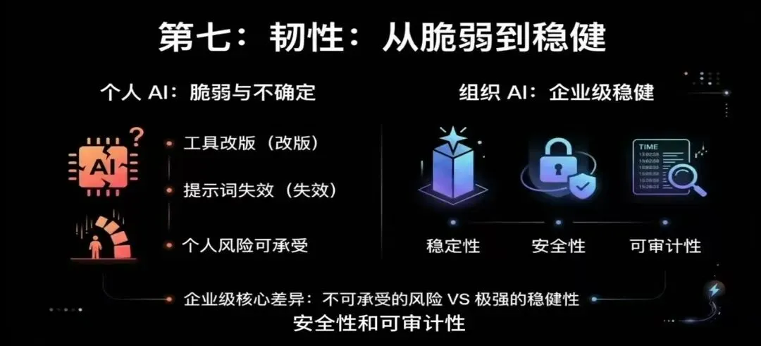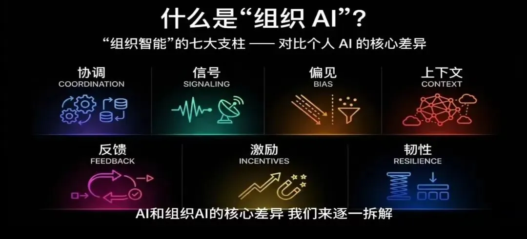 “组织智能七大支柱”,这正是区分个人AI和组织AI的关键——个人AI解决“单点效率”,组织AI解决“系统价值”,两者的差距,就是个体高效与企业低效的鸿沟。
