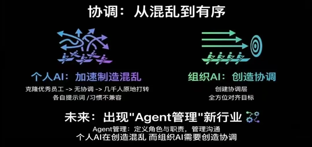 个人AI让你跑得更快,但没有协调层,你只是在加速制造混乱。未来,一定会出现一个全新行业——Agent管理,专门定义Agent的角色、职责,协调Agent之间的沟通,解决“各自为战”的内耗。