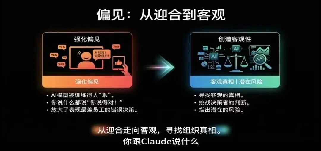 个人 AI 是“应声虫”。 现在的模型被训练得太“乖”了,无论你说什么,它都说“您说得对”。这对优秀员工是锦上添花,对平庸员工则是灾难——强化了他们的偏见。