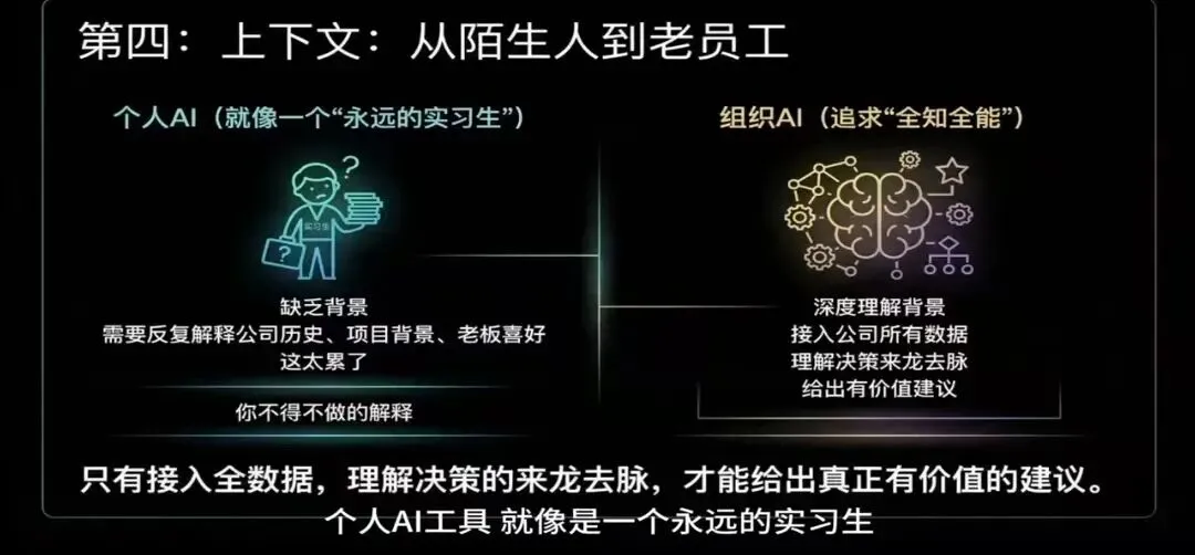 个人AI就像一个永远的实习生,聪明但无知;而组织AI,需要接入公司所有数据,理解每一次决策的来龙去脉,知道团队的优势、短板、过往的坑,才能给出真正有价值的建议,而不是“泛泛而谈”。