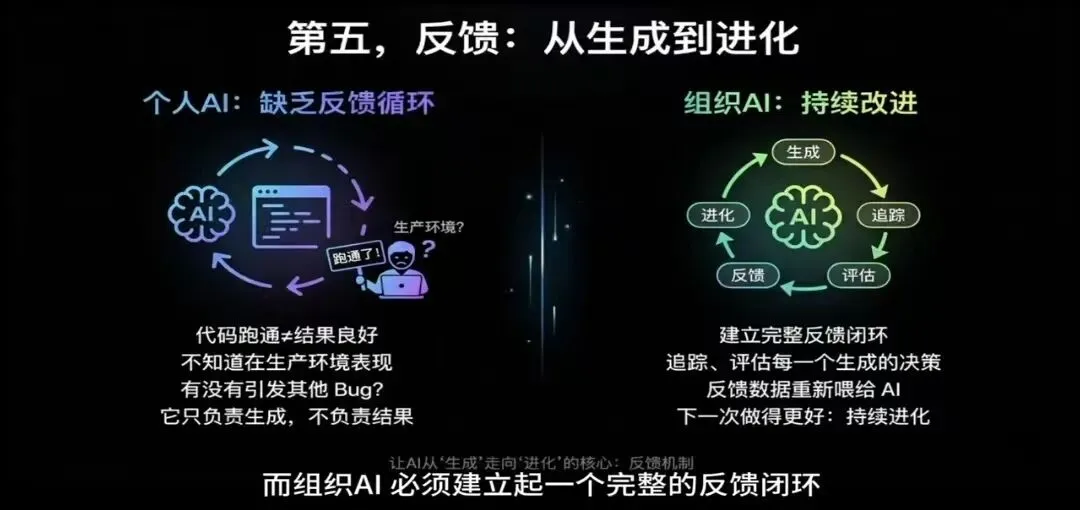 个人AI没有反馈循环,组织AI需要闭环迭代:它生成的每一段代码、每一个决策、每一份方案,都需要被追踪、被评估,然后把这些反馈数据重新喂给AI,让它在下一次做得更好,形成“生成-评估-优化”的良性循环。