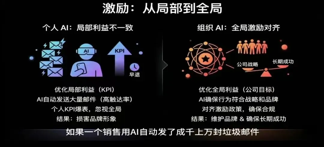 比如一个销售,用AI自动发成千上万封垃圾邮件,他的回复率、KPI可能爆表,但公司的品牌形象,可能被彻底毁掉。个人AI在优化“个人局部利益”,而组织AI,需要优化“公司全局利益”,让每个个体的AI使用,都能服务于公司的核心目标。