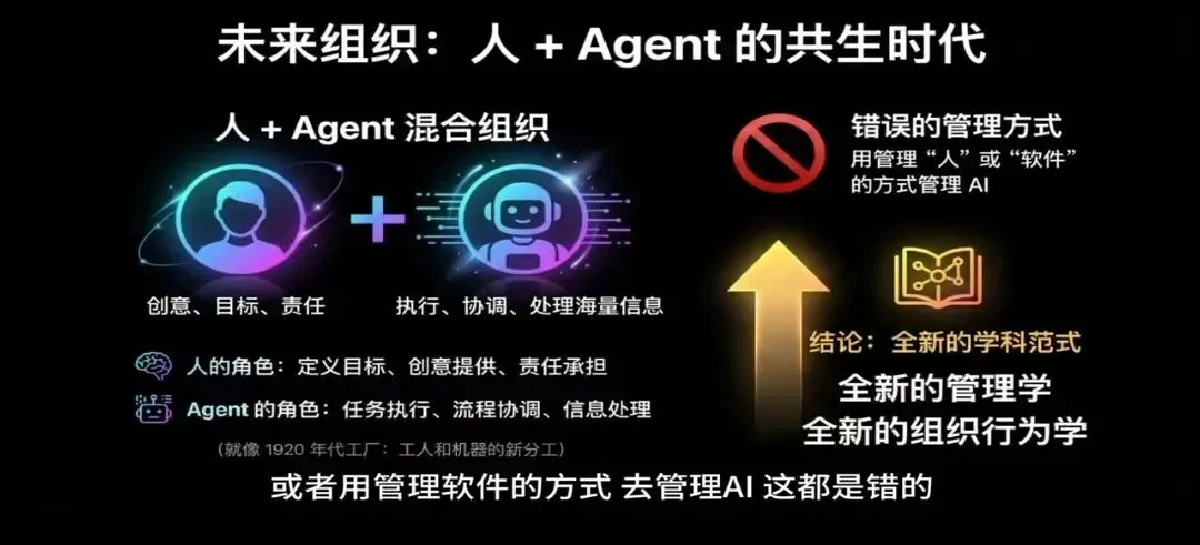 但现在,很多公司还在用管理人的方式去管理 AI,或者用管理软件的方式去管理 AI——这全是错的。你现在做的,是在给一辆马车装上火箭发动机。它跑不快,只会散架。