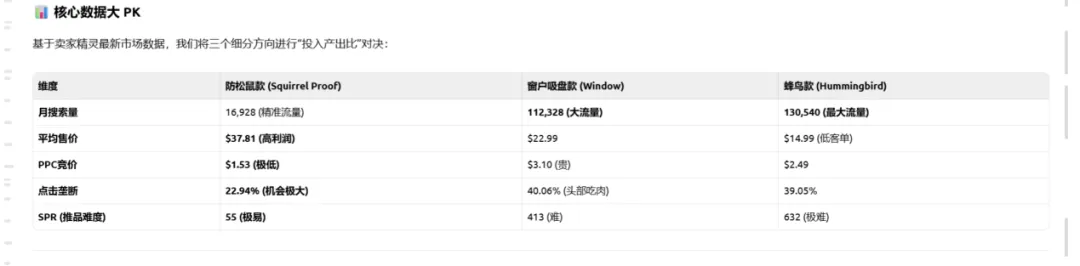 它就相当于给 AI 装了个亚马逊专属 “数据接口”,直接打通卖家精灵的全量官方数据库,AI 再也不是空口说白话,每一个建议都有真实运营数据兜底。就说上个月,我想找北美站新手能入局的家居细分赛道,直接在对话框输完需求,几秒就出了结果 ——Listing 详情、真实月销量、精准流量词、PPC 竞价数据全给你拉得明明白白,连竞品的 BSR 走势、优惠节奏都扒得一清二楚。