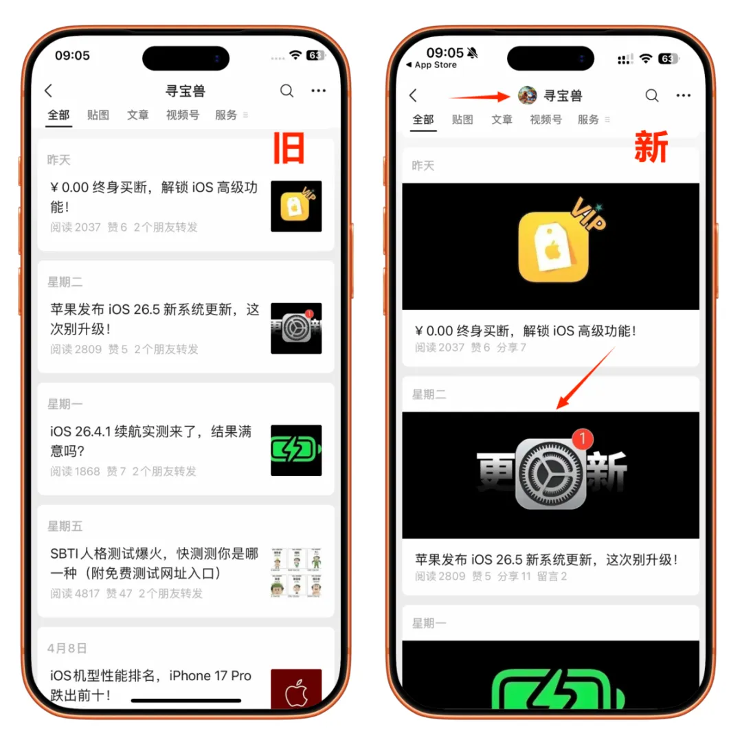 iOS 微信 8.0.71 新版本发布,有这些新变化!昨天晚上,iOS 微信 8.0.71 正式版突然发布。本次更新,距离 3 月 21 日发布的上个 8.0.70 版本,间隔 25 天。虽然官方更新日志依然是万年不变的「解决了一些已知问题」,但实际隐藏了多项灰度测试新功能以及一些细节优化。表情助手小程序上线现在,打开「微信表情助手」小程序,就可以上传自制表情包。上传后,制作的表情包就会显示在视频号的首页「表情」专区,其他人可以直接添加表情包或者将表情包转发给朋友,还从你的表情包作品直接跳转到你的视频号,一眼识别到表情包原创作者。除了聊天对话框,表情包还能出现在朋友圈、公众号和视频号评论区,或作为视频号点赞的特殊彩蛋。不过「微信表情助手」目前仅对个人视频号作者开放。专业表情艺术家则可以使用「微信表情开放平台」来上传「表情专辑」或「特效作品」。公众号界面小改动iOS 微信 8.0.71 版本有一个小变化,在公众号主页的文章封面变成了大图模式,不再是此前的小图模式了,而且顶部还新增了头像显示;看起来更加直观。与此同时,最近 iOS 微信还在灰度测试一项新功能:阅读公众号文章时,长按点赞、喜欢、关注等按钮,可以快速切换操作身份。你可以选择使用自己的微信号、贴图号或者公众号身份来进行相关操作。聊天中文件支持 AI 总结微信悄悄给聊天文件加上了 AI 总结功能,在聊天里长按文件,就能看到 “总结” 选项,点击后会跳转到腾讯元宝 APP 生成内容概括。目前支持 PDF、Word、Excel、PPT、TXT、CSV、代码文件等 30 多种格式,不用下载完整文件就能快速了解核心内容,省时又省空间,不过需要搭配腾讯元宝 APP 才能使用。听全文播放界面收听公众号文章时,主界面新增同步显示字幕,轻点可查看全文,还能滑动浏览,真正实现了边听边看。听一听的悬浮窗也悄悄进行了改进,包括微信听音乐以及公众号的听全文悬浮窗。现在的悬浮窗看起来更加简约,不会显示音频封面的缩略图,展开后会显示文章标题或者歌曲名称以及操作按钮。合并发图功能仍在灰度除此之外,此前聊天发送多张图片折叠显示的功能,目前还是没有全量开放,没有的小伙伴还是得等等了!以上就是近期 iOS 微信的一些新变化,升级了新版本的小伙伴,如果发现了更多功能或改动欢迎留言分享。现在 8.0.71 版本 iOS 微信已经在 App Store 上线,需要的小伙伴可以在 App Store 直接更新。