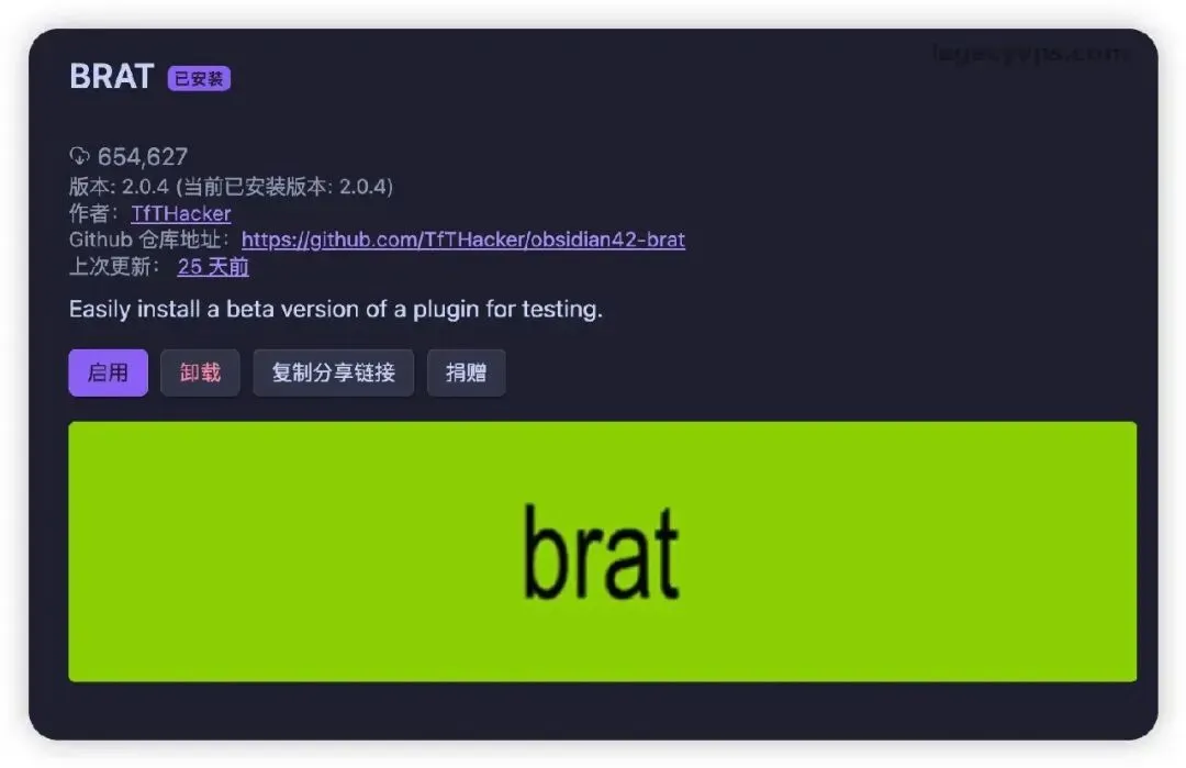 因为Claudian 还没进官方插件市场,所以我们需要通过 BRAT 装。BRAT 是 Obsidian 社区专门装 beta 插件的工具,非常的安全和高效。