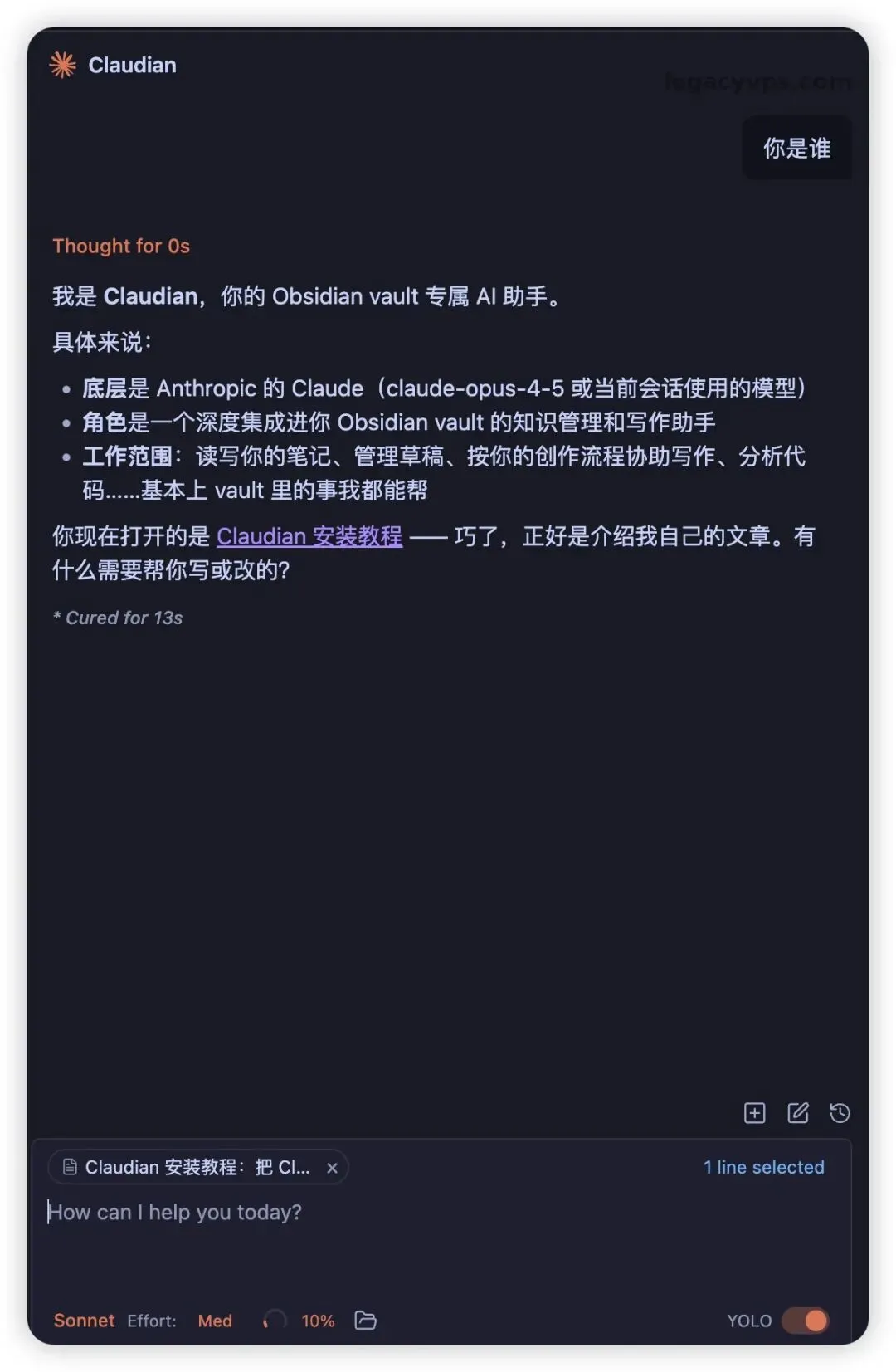 到这里,Claudian 装完、侧边栏能对话,安装这件事就算结束了。但装上只是把路打通——斜杠命令怎么用、@提及笔记怎么喂上下文、计划模式怎么拆任务,这些才决定它到底是个聊天框还是你的写作搭档。下一篇再讲。