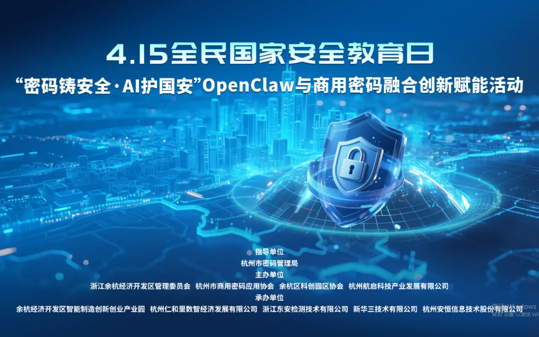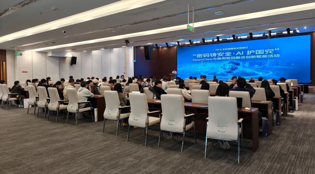4月15日,在第11个全民国家安全教育日来临之际,“密码铸安全・AI护国安——OpenClaw与商用密码融合创新赋能” 主题活动在杭州市余杭区仁和里・杭实智造中心报告厅顺利举办。