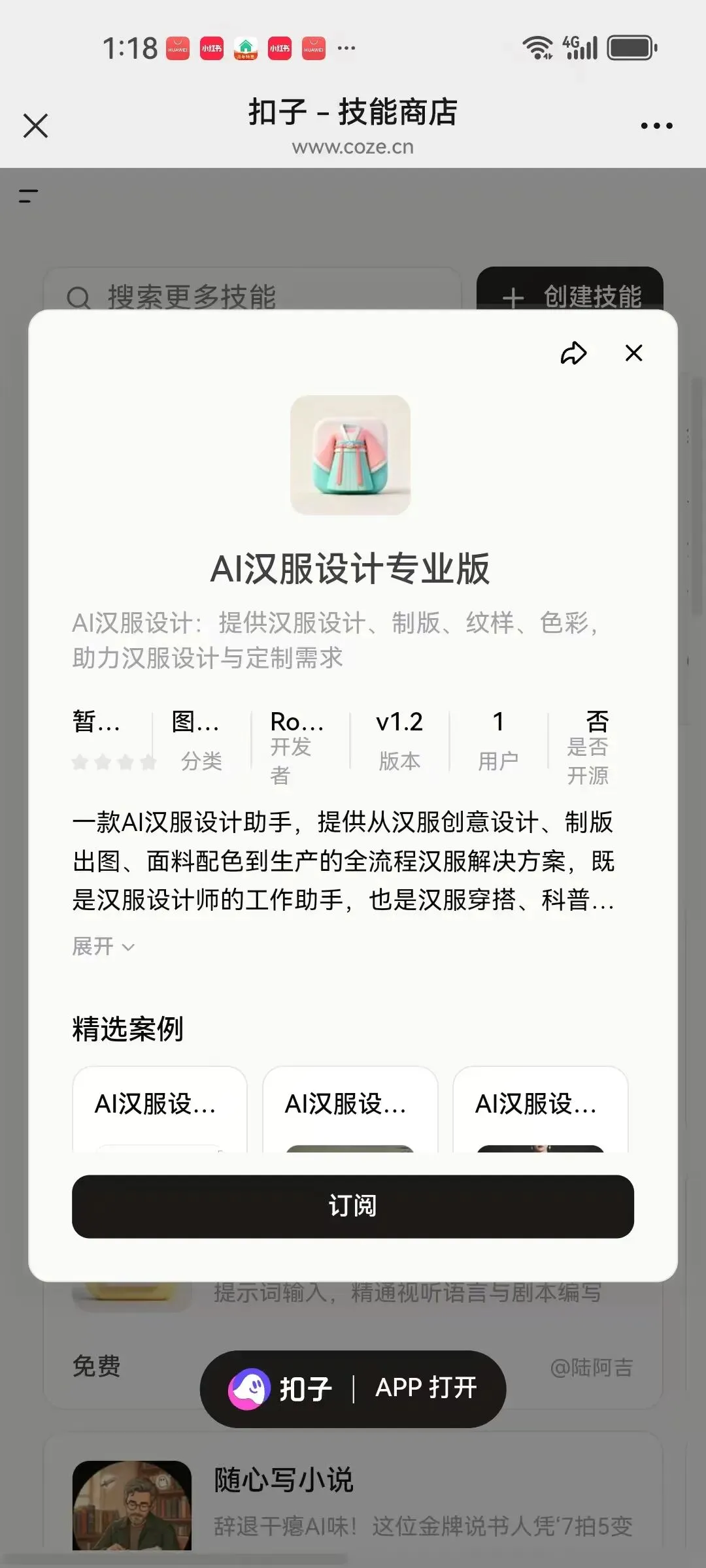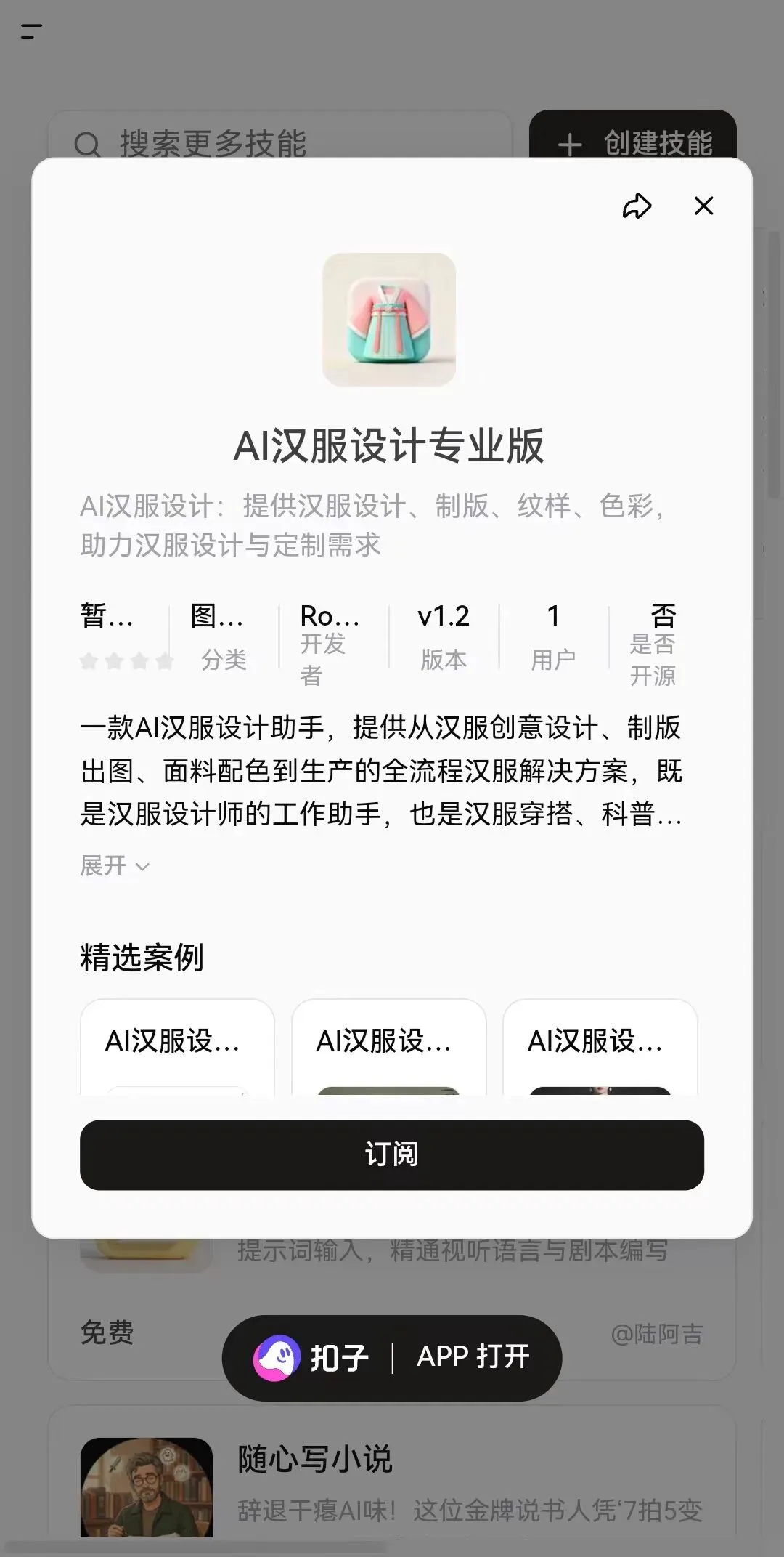 于是不看书了,直接在Coze网站上自己摸索,看见了技能,打开之后发现,比较适合我的需求,于是做了部署,完成了我的设计制作:一个AI汉服设计助手。
