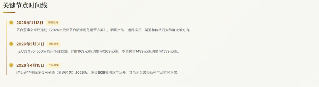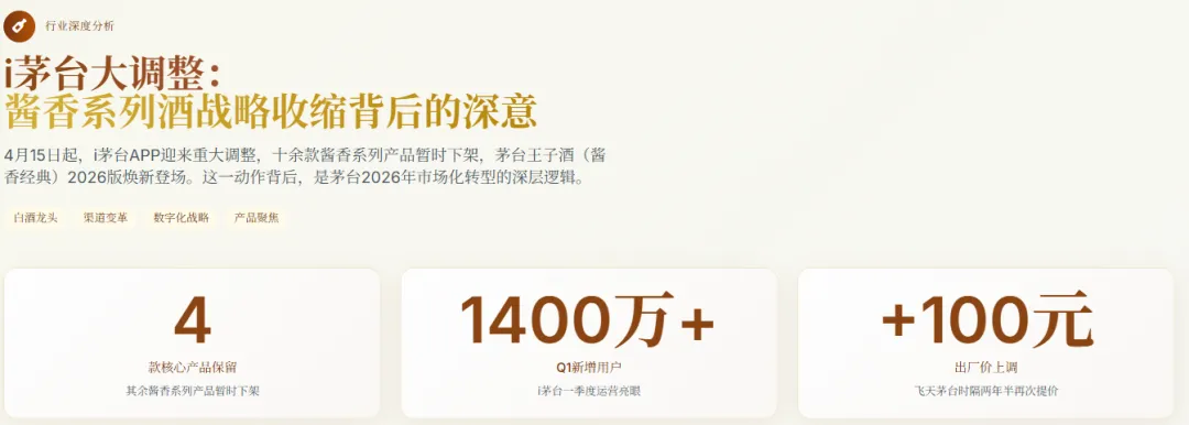 - 具体动作:4月15日起,i茅台平台大幅收缩酱香系列酒产品线,仅保留茅台王子酒(酱香经典)2026版、茅台1935等四款核心产品。同时,王子酒推出包装焕新的2026版,并配套“启新·众享”线上活动。