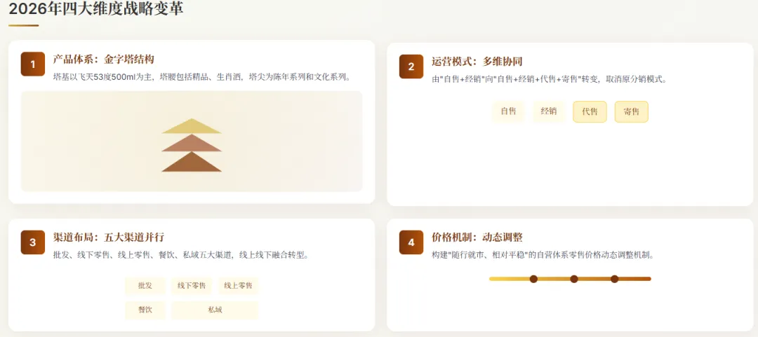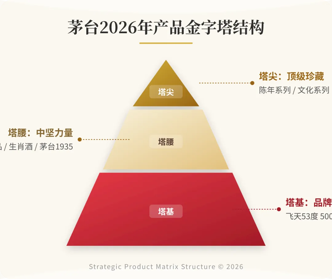 2026年1月13日,贵州茅台董事会审议通过《2026年贵州茅台酒市场化运营方案》,正式定调今年在产品、运营模式、渠道和价格四大维度的变革方向。- 产品体系:金字塔结构