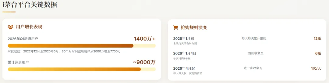 2026年一季度,i茅台新增注册用户近1400万,成交用户超398万。对比过往数据更显增速惊人:2022年12月至2025年5月,30个月时间注册用户从3000万增至7700万;而2026年仅前三个月,新增用户就达1400万。抢购规则持续收紧